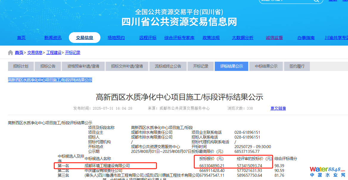 近6億元!成都環(huán)境投資子公司預(yù)中標(biāo)本地水質(zhì)凈化中心項(xiàng)目 四川省成都高新西區(qū)水質(zhì)凈化中心項(xiàng)目施工 / 標(biāo)段評標(biāo)結(jié)果公示,公示顯示,成都環(huán)境工程建設(shè)有限公司以573415093.74元的價格成為該項(xiàng)
